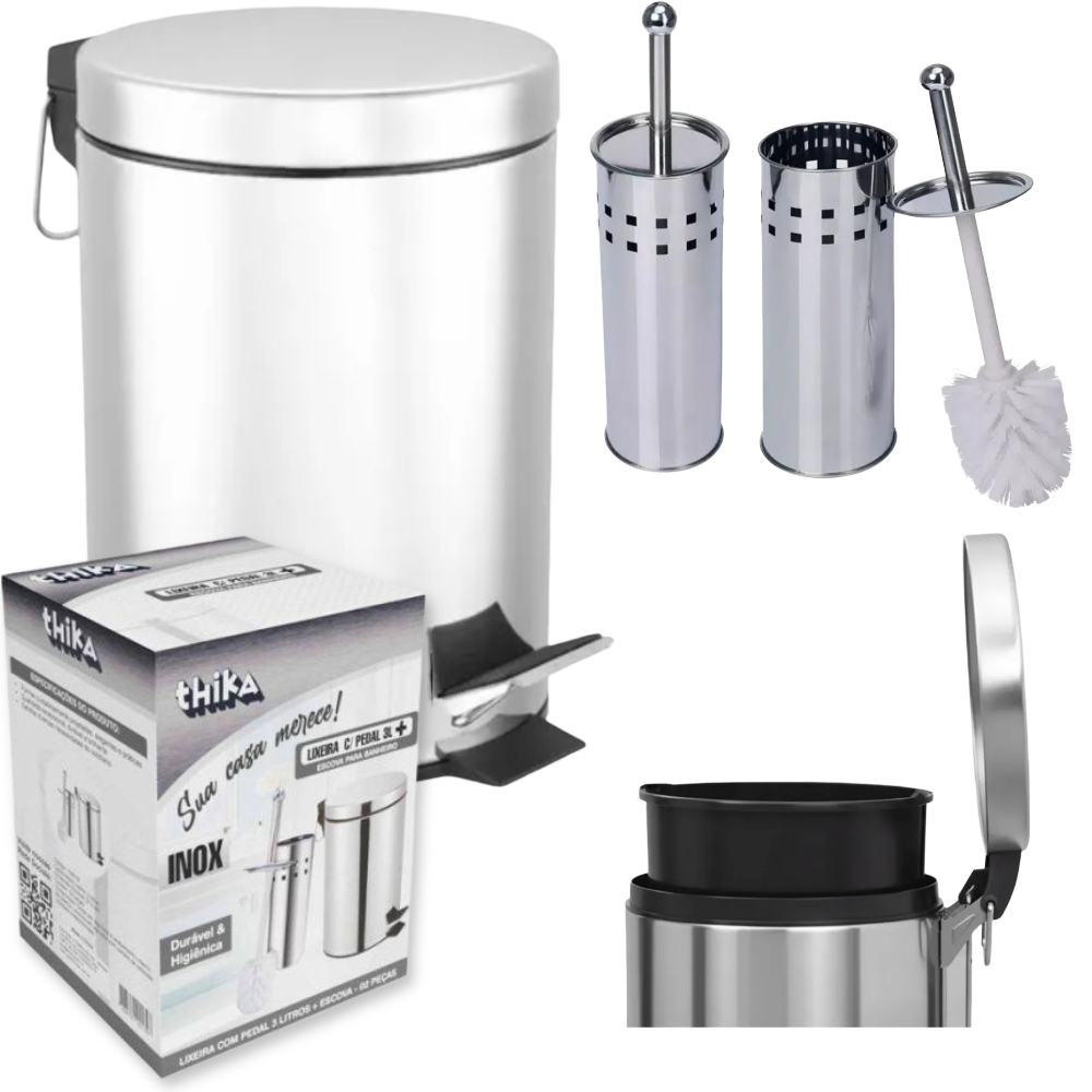 Kit Lixeira Banheiro Inox 3L com Pedal e Escova Sanitária + Suporte | Design Premium e Higiene